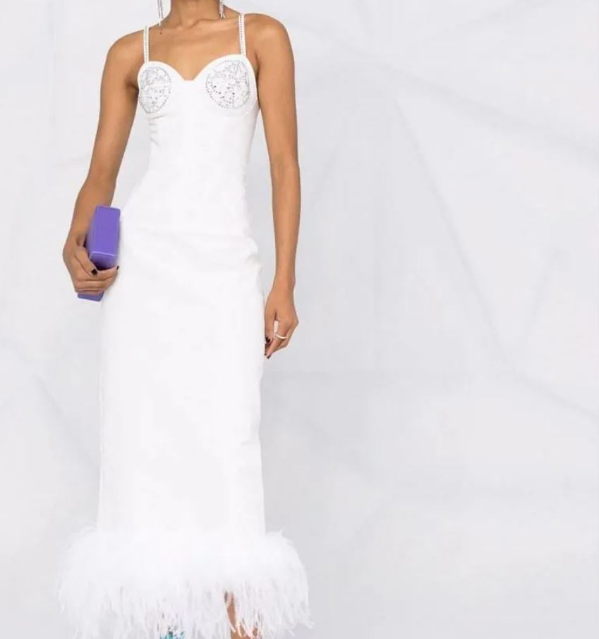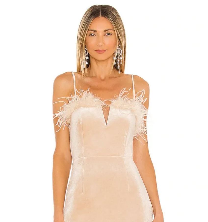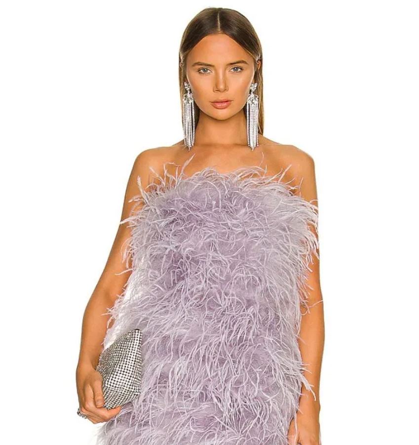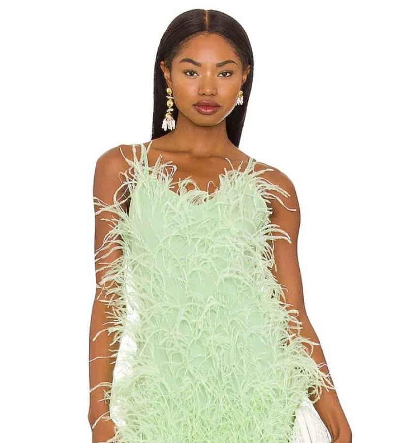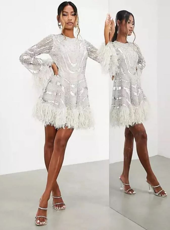 Long sleeve embellished waisted mini dress with feather trim, $458, Asos Edition