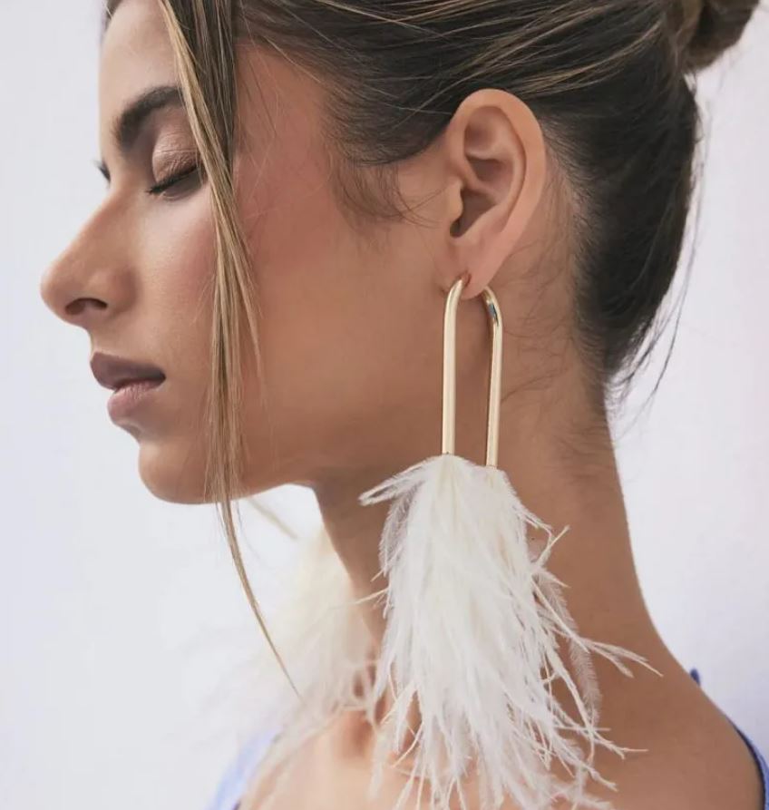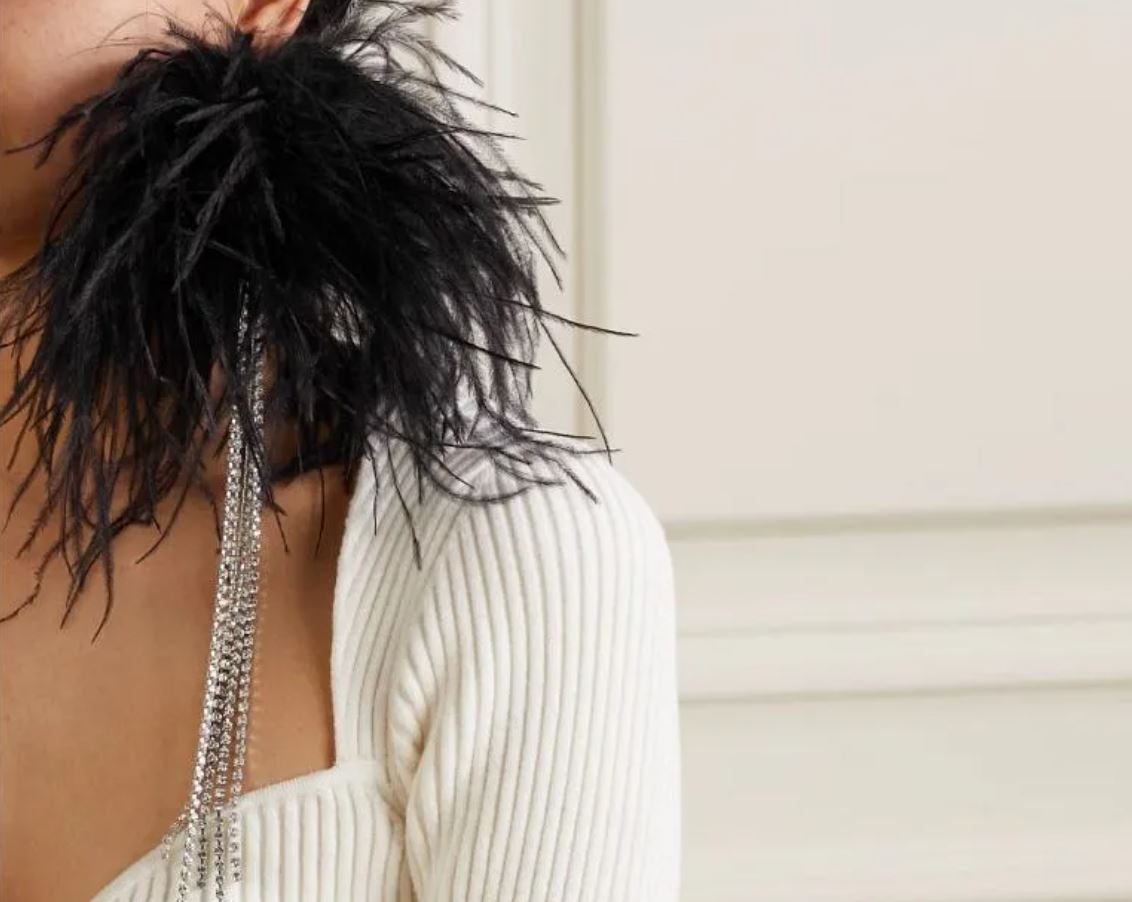 Feather-trimmed silver-tone crystal single earring, $384, Magda Butrym
