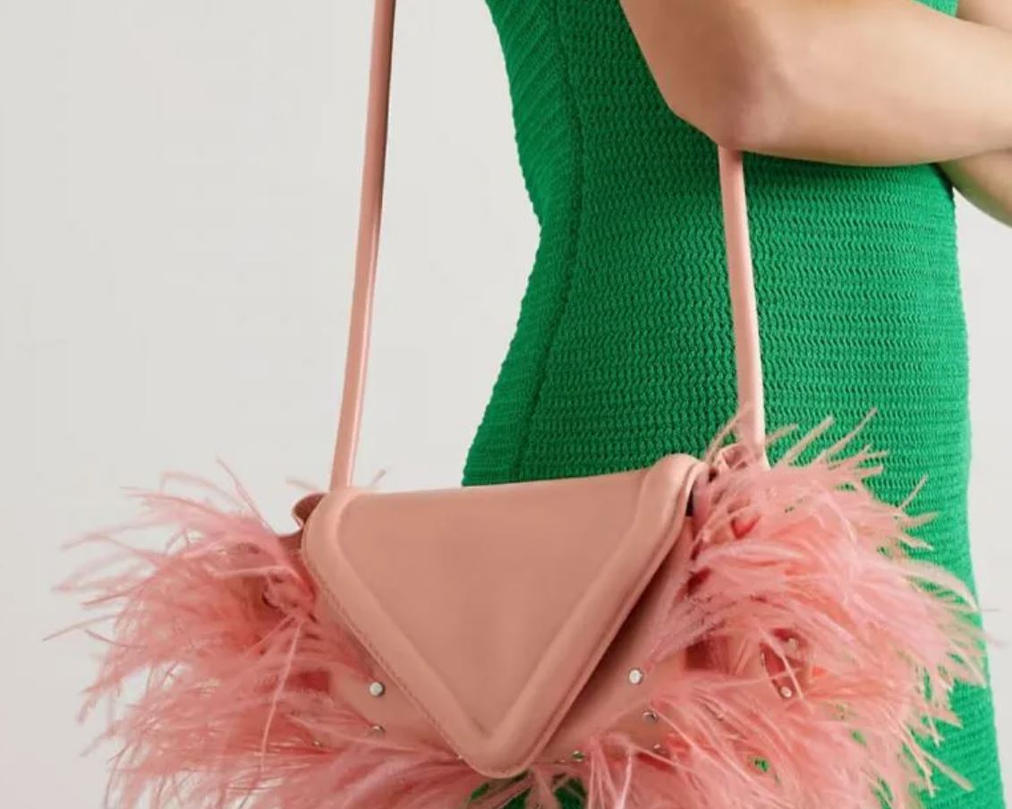 Beak feather-trimmed studded leather clutch, $6,667, Bottega Veneta