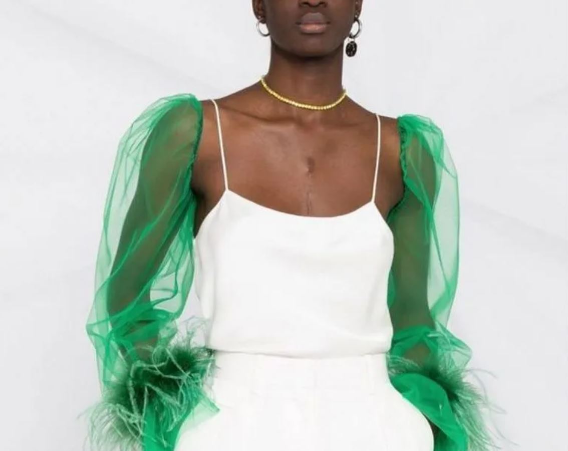 Feather-trimmed silk tulle blouse, $4,330, Saint Laurent