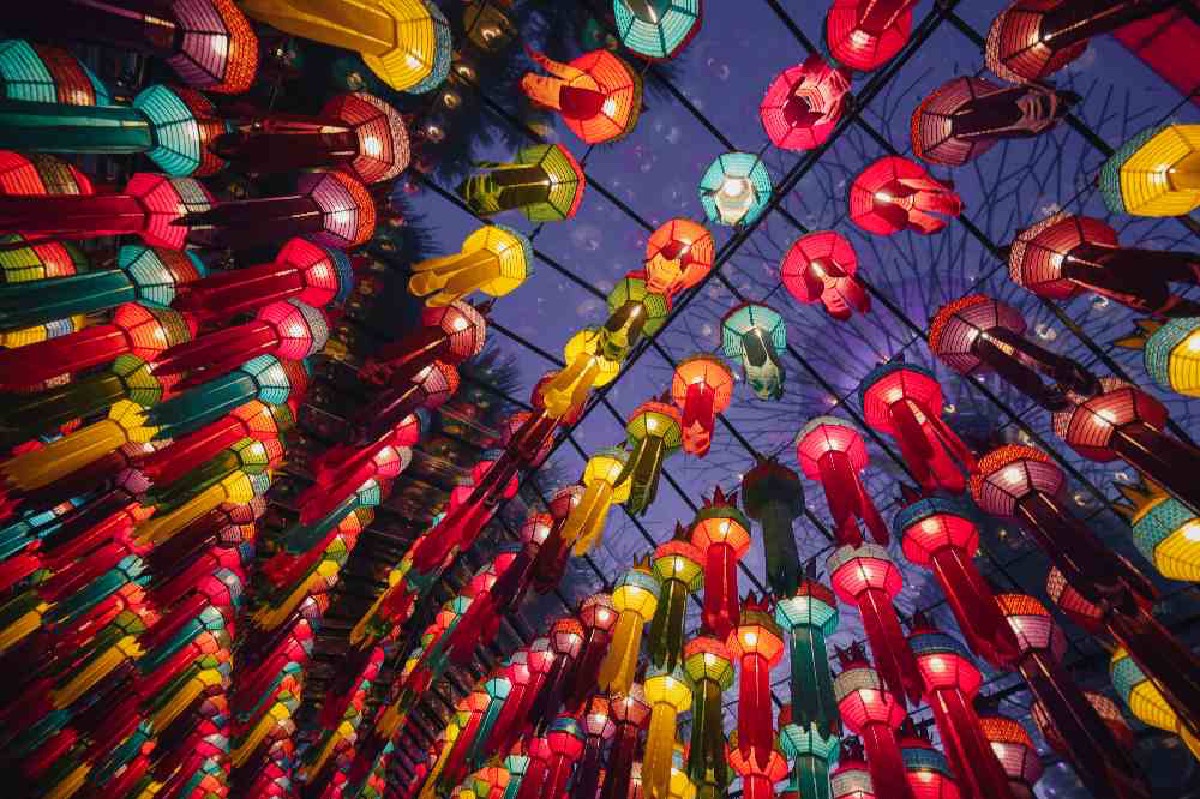 This lantern set consists of an archway which brings to mind the Lanna architecture style, decorated with colourful traditional lanterns representing spiritual devotion (also known as Shan lanterns).
