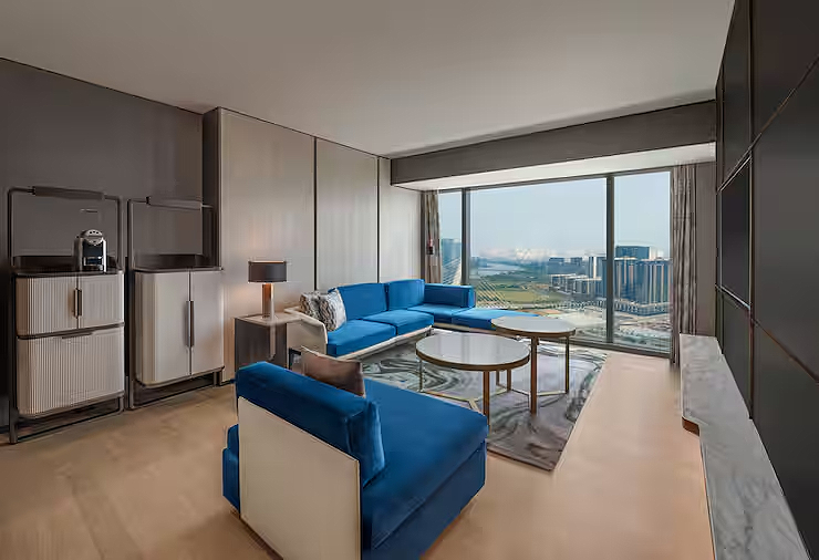 We stayed in a king one-bedroom suite connected to a premium corner king room, both with river views.