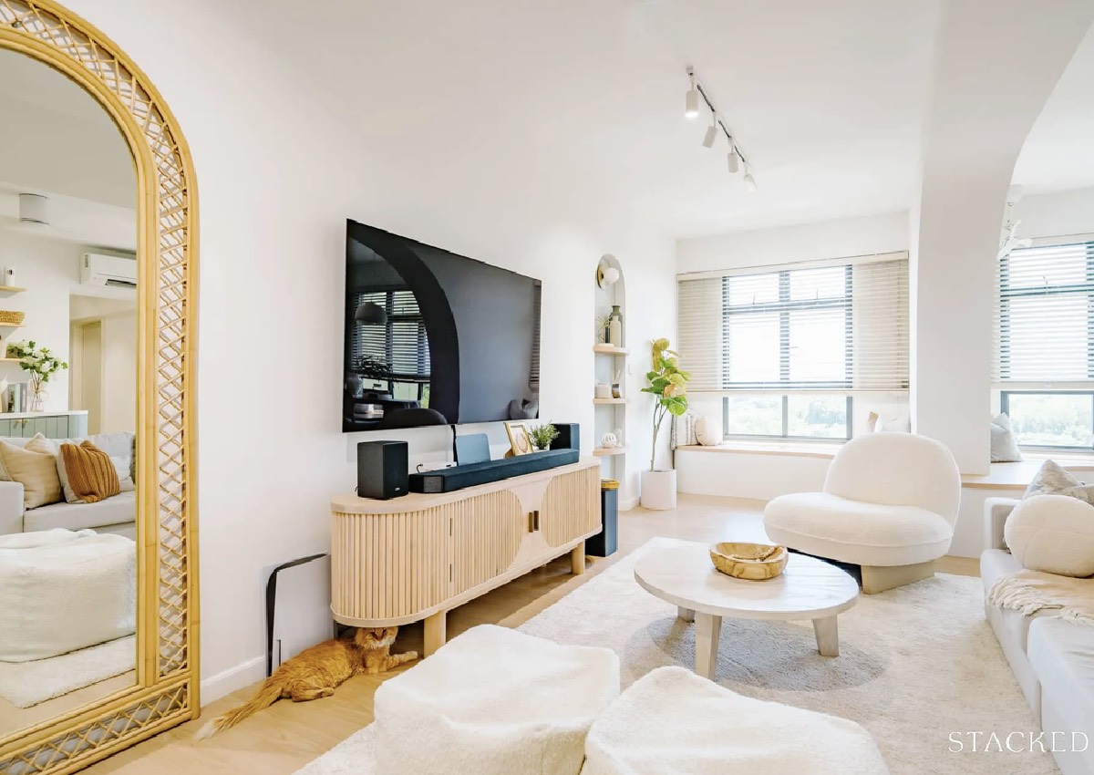 Sometimes, home renovation isn't as simple as one might imagine. Constraints like immovable walls and architectural quirks can become obstacles to our dream design. This was the case for A (@ohhmyy.home) and her husband, who had to work around a structural pillar in their living room while renovating their home in Sengkang West Way.