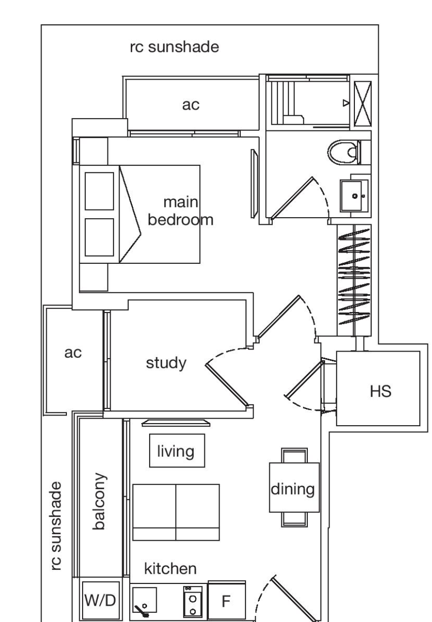 | Squarish and efficient unit layout. | Tight dining area, alternatively, one could opt for al-fresco dining in the balcony area |