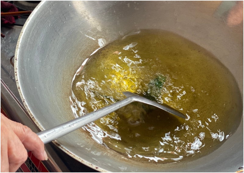 Once you have all the ngoh hiang ready, load up the oil in a frying pan and add some pandan leaves to infuse it.