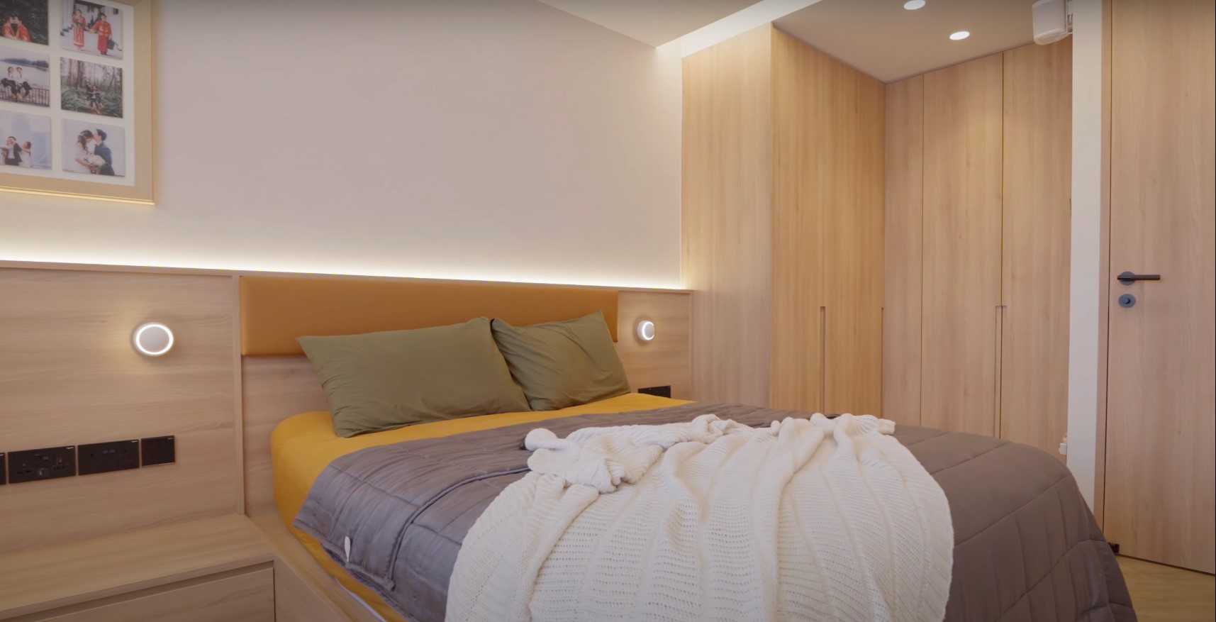 Opposite this room is the master bedroom, featuring an L-shaped full-height walk-in wardrobe in a dedicated corner, providing ample storage for the homeowners. A queen-sized bed occupies the centre of the room, with sufficient space for bedside tables on either side.