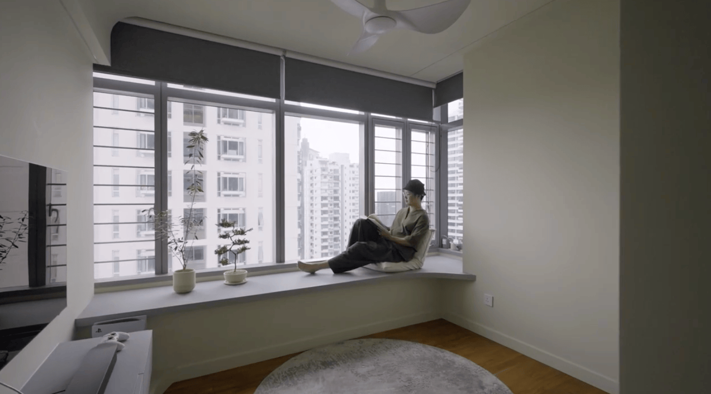 The living area, devoid of a TV console, provides ample room to move around. The large balcony offers a refreshing view of the Singapore skyline and natural ventilation, eliminating the need for artificial cooling.