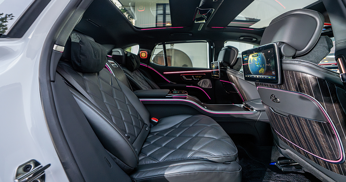 Inside, the Night Series features what Mercedes-Maybach calls the First-Class Rear, which turns the car into a strict four-seater. A centre console runs in between the two seats and houses, among other things, two folding tables (like on an airliner), two temperature-controlled cup holders, a chilled compartment for champagne bottles, and several USB-C and HDMI ports that allow passengers to connect their personal devices.