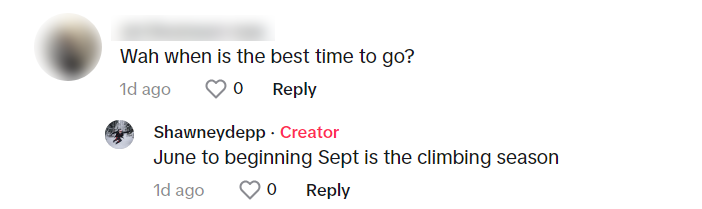 One user asked what's the best time to visit Mount Fuji, to which Shawne replied, June to the beginning of September, which is considered to be the climbing season.