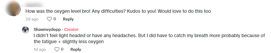 One user was curious about how he coped with the high altitude. Luckily, Shawne didn't feel lightheaded or have any headaches; he shared that he just felt that he had to catch his breath more.