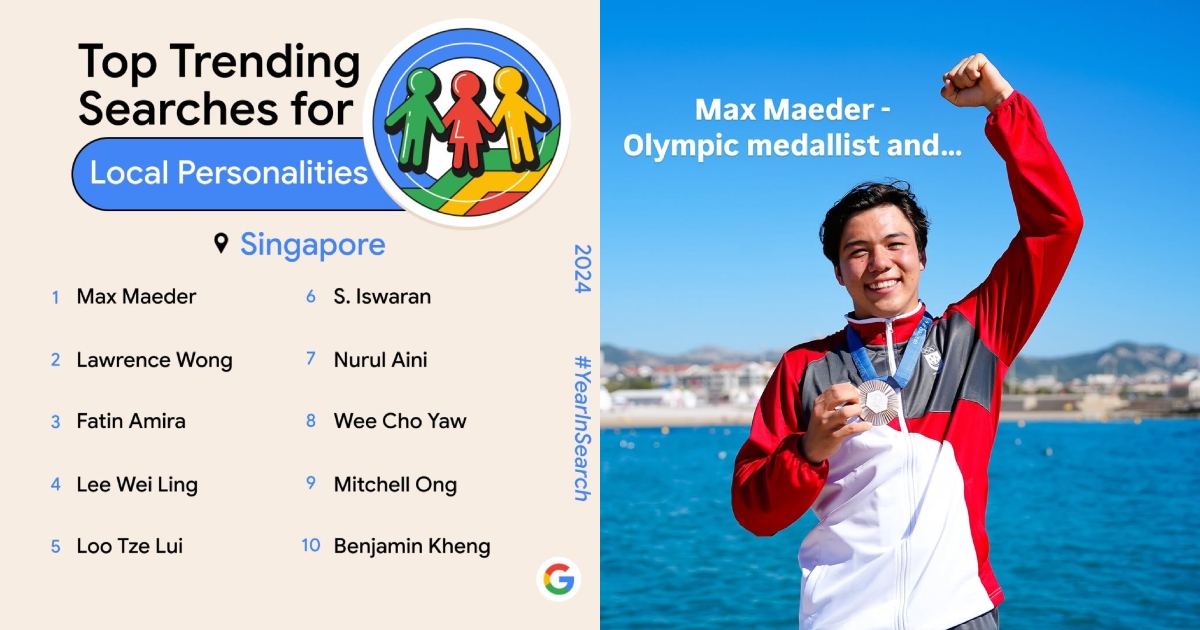 On the Trending Local Personalities list, Singaporean athlete Max Maeder takes first place. The 17-year-old wowed the nation after securing a bronze medal in the Men's Kitefoiling category at the Paris Olympics 2024 — making him Singapore's youngest Olympic and sailing medallist. He also came in sixth on Trending Singapore News.
