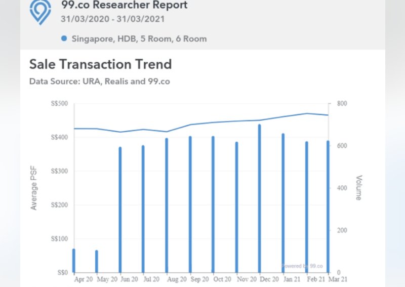 On a psf basis, the average price of a five-room flat in 2021 is $465 psf. The average price, island-wide, was $585,944 as of March 2021. The sharp pick-up in transaction volumes on the graph was due to the Circuit Breaker last year.