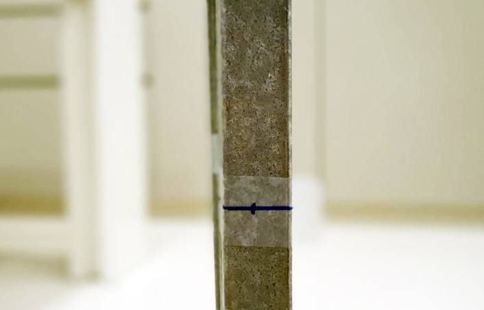 Tape the shelf-leg with masking tape, before marking the exact position of the relocated screw-hole with a cross, with the permanent marker.
