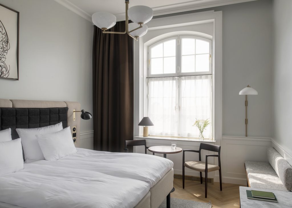 On the lower floors, some of the rooms have a 4m-high ceiling with nearly floor-to-ceiling windows, while the upper floors feature limewashed walls, exposed timber beams and expansive views across the Danish capital.