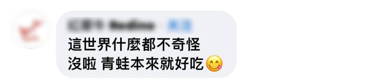 However, some commenters pointed out that although frog dishes are seen as normal in Taiwan, the way the frog is prepared in the ramen dish is unappetising: "I like eating 'field chicken' but I do not dare to eat when the frog is like this [unpeeled and uncut]."