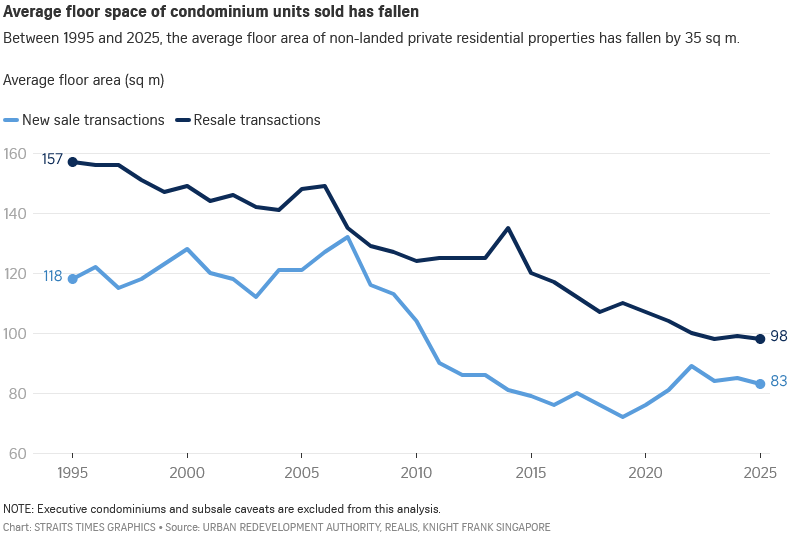 In 1995, the average floor area of non-landed private residences up for new sale transactions was 118 sq m, according to an analysis of Urban Redevelopment Authority (URA) data by real estate consultancy Knight Frank Singapore. By 2025, that figure had fallen to 83 sq m.