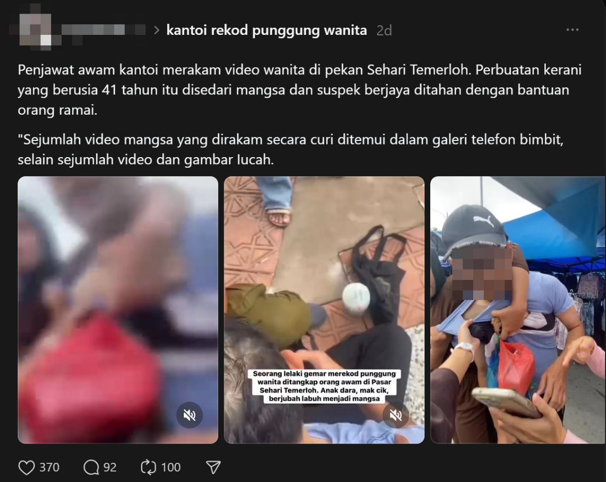 The caption on another video reads: "A man who recorded a woman's buttocks was caught by members of the public at Pasar Sehari Termerloh. Young and unmarried girls, and aunties wearing loose clothing have become victims."