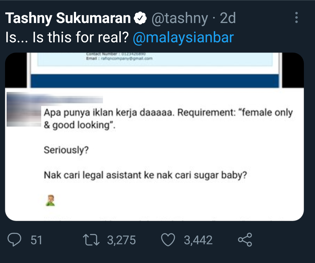 "Are you looking for a legal assistant or a sugar baby?," a netizen spoke out in a Facebook post on Monday (Mar 8) after she came across the advertisement on the Malaysian Bar's online job search platform.