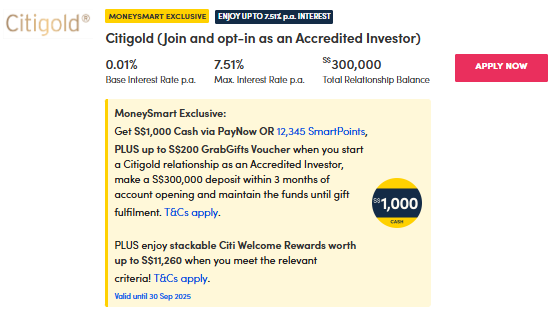 | Citi Wealth First Account | Up to 7.51% (on first $50,000 – $500,000, fulfil 5 criteria) | Those with other Citibank products |