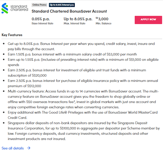 | Standard Chartered BonusSaver | Up to 8.05% (on first $100,000, fulfil 4 criteria) | High spenders |