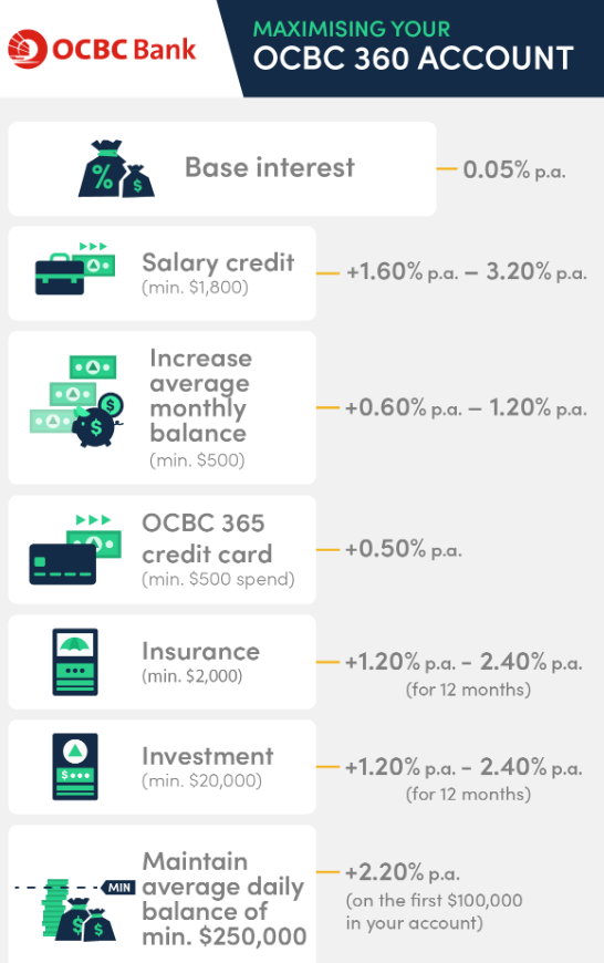 | OCBC 360 | Up to 5.45% (on first $100,000, fulfil 5 criteria) | Lower income earners ($1,800 min. salary) |