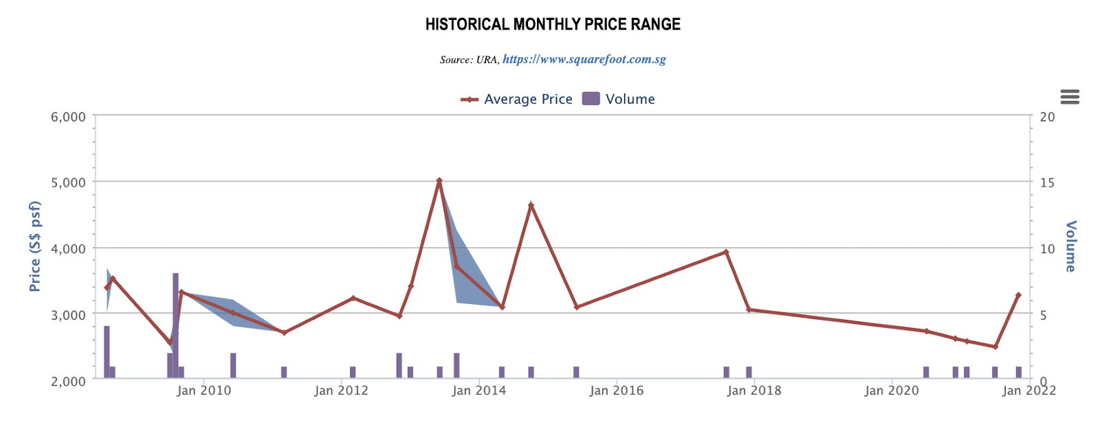 From the chart, we can see prices drop in 2013. I’d assume that the increase in ABSD introduced in January 2013 had its toll on the project’s performance. The location might also be inconvenient for families without a car and there is a lack of schools nearby.