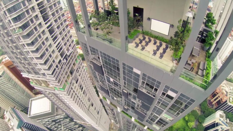 It includes a relaxation area with gardens and a hot spa called The Retreat at level 56 and a 360-degree viewing Vista Deck on the top 72nd floor.