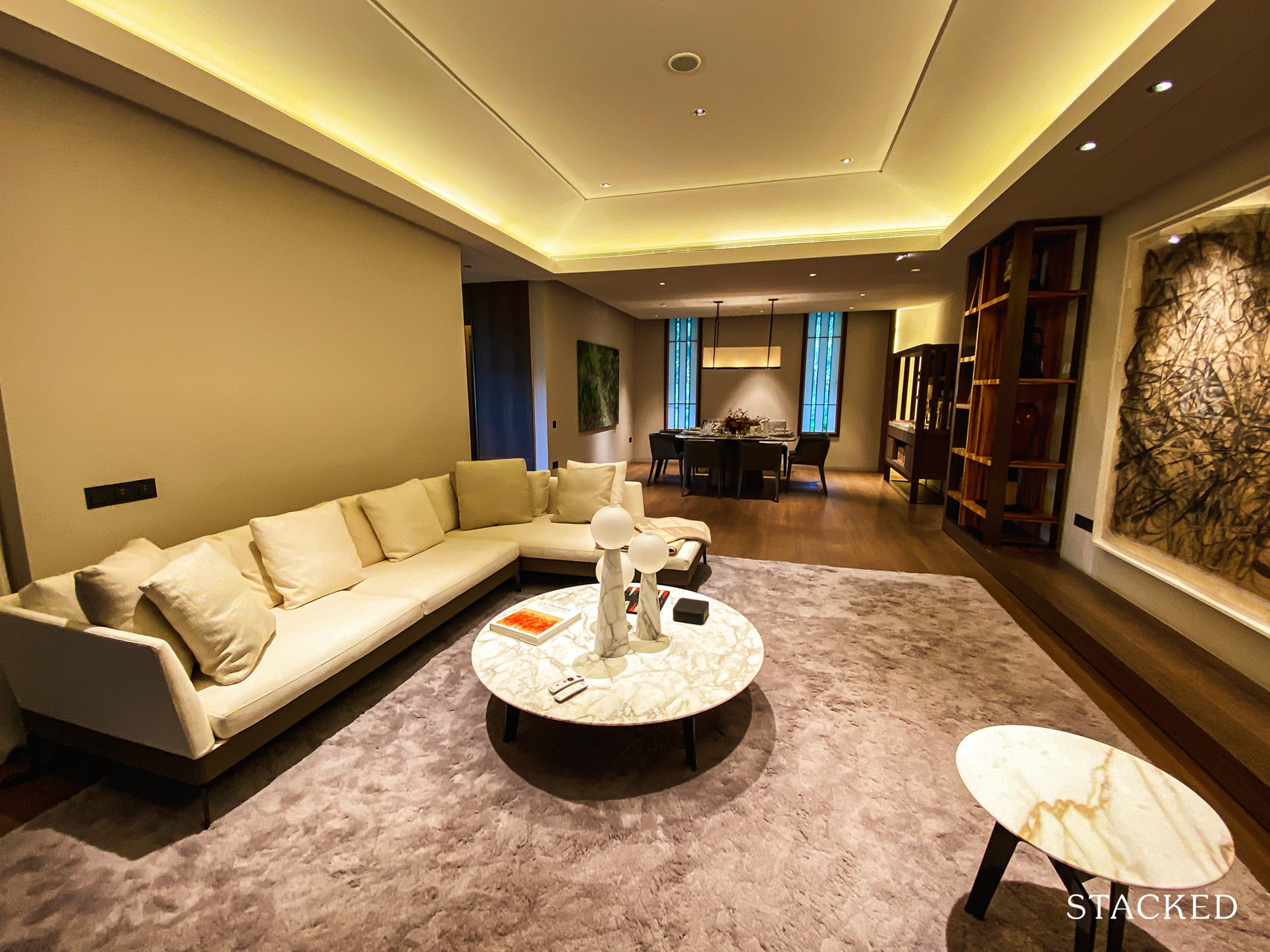 Bear in mind this is a proper sized L-shaped couch as well, which definitely is a good size for a 4 bedroom unit. Alternatively, you could do a couch on one end and two opposing armchairs – a layout quite popular in luxury apartments.