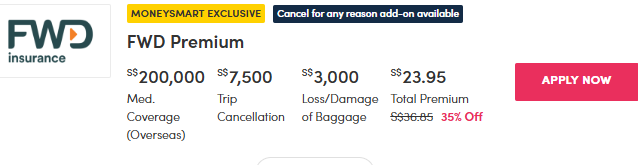 | FWD travel insurance | $34 – $61 (Promo: $22 – $40 with 35per cent off) | From an additional $6+ |