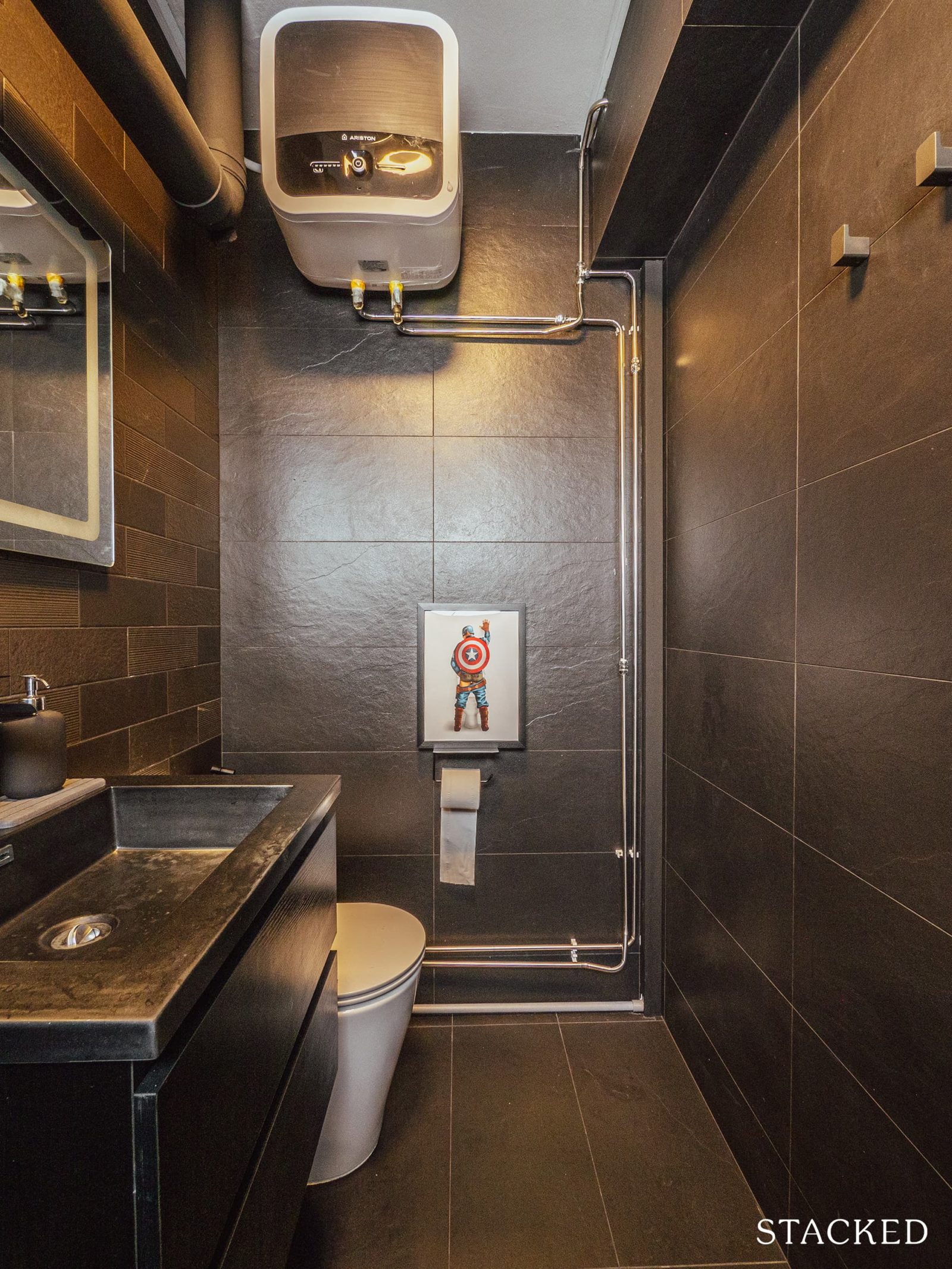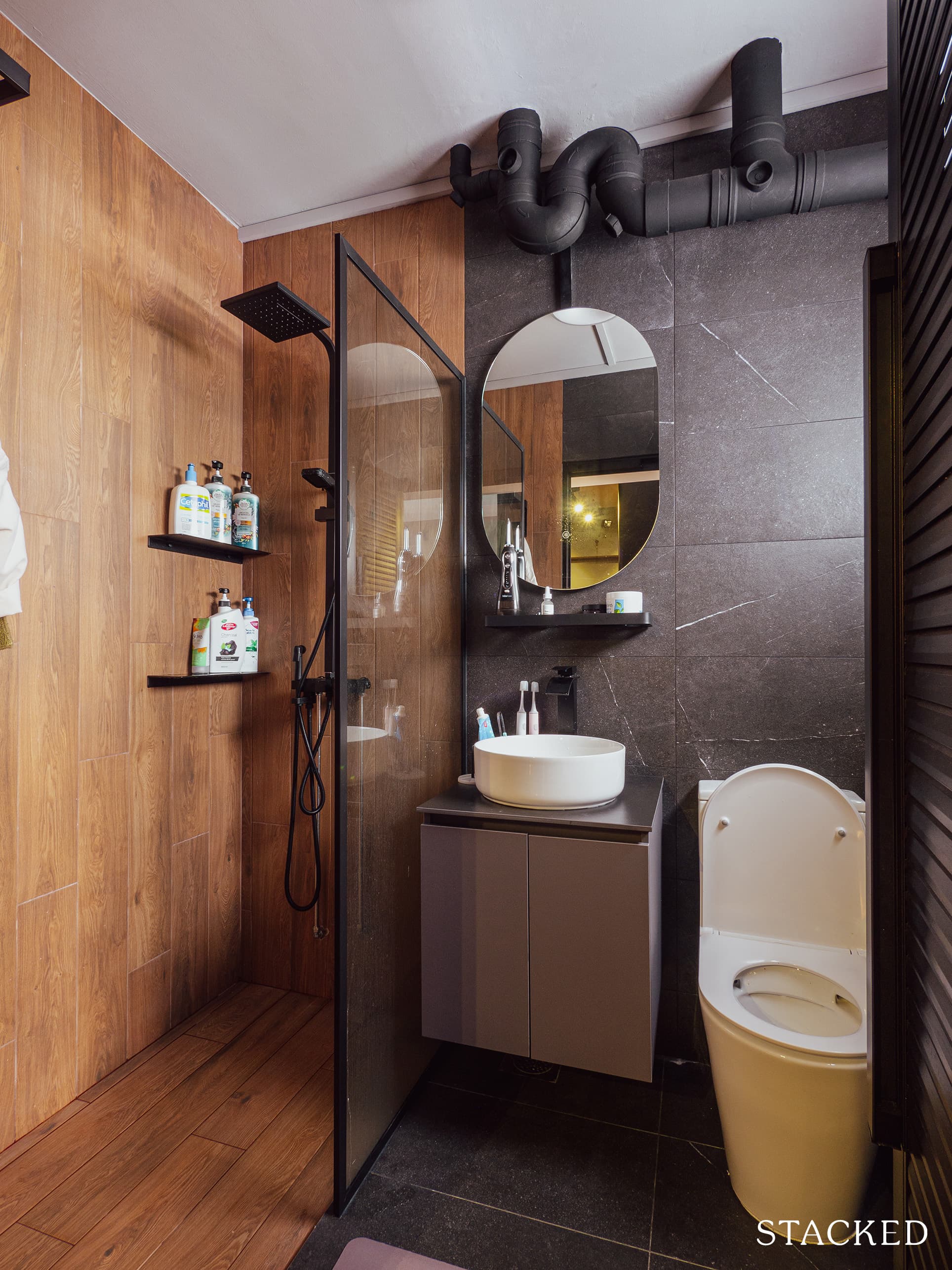 While some people may shy away from dark colours in the bathroom, it does have a very striking look when executed well. The bathrooms give off an old-school vibe – it’s like you’re in 1920s New York, especially with the pipes exposed.