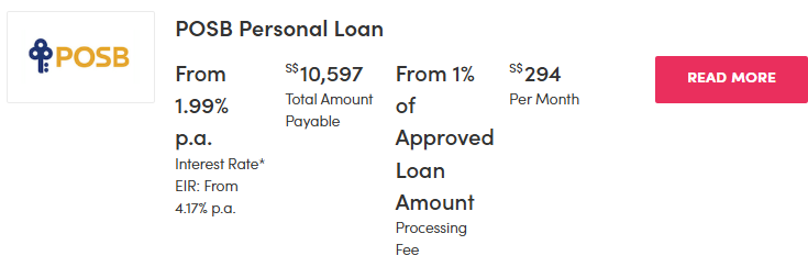| DBS/POSB Personal Loan | 1.99per cent (EIR 4.17per cent) | 1per cent | ~$294 | – Singaporean/PR – Foreigners with existing Cashline and/or Credit Card account – Min. S$20,000 annual income – Existing DBS/POSB customers |