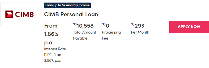 | CIMB Personal Loan | 1.86per cent (EIR 3.56per cent) | 0per cent | ~$319 | – Singapore Citizen/PR: $20,000 – Malaysian (residing in SG): $30,000 |