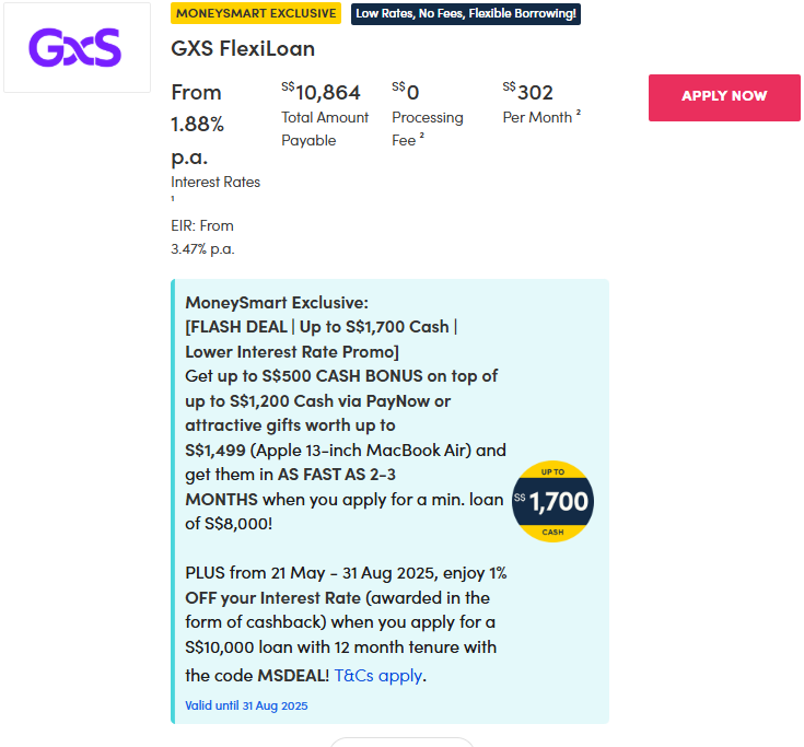 | GXS FlexiLoan | 1.88per cent (EIR 3.47per cent) | 0per cent | ~$302 | – Singapore Citizen/PR: $20,000 |