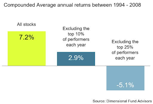 A study done by Dimensional Fund Advisors shows that missing out on the top performers in the global stock market (weighted by market cap, across developed and emerging market) will lead to significantly poorer returns.