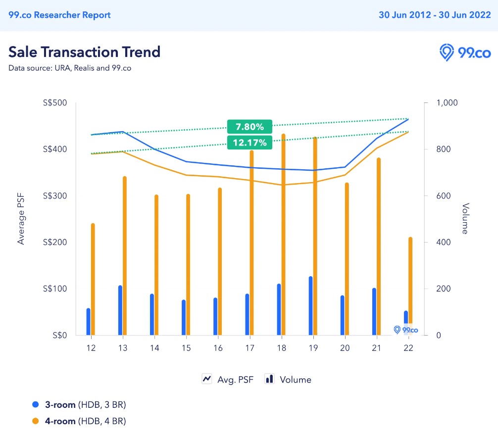 The price appreciation of 3-room flats fared better against that of 4-room flats, with a price appreciation of 12.17 per cent versus 7.80 per cent.