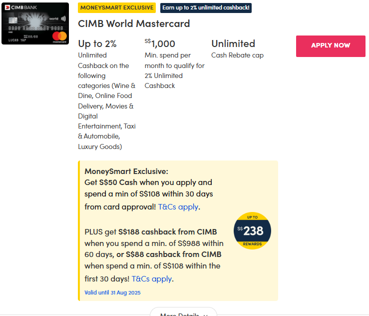 | CIMB World Mastercard | – $50 cash – Up to $188 cashback | – $188 spend within 60 days – $988 spend within 30 days | 31 Aug 2025 |