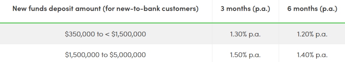 If you're new to Citibank and have at least $350,000 you're looking to place in a fixed deposit, yo can enjoy up to 1.30 per cent p.a. over a three-month tenure. Have even more cash to stash? New Citibank customers with $1.5 million can unlock the highest rate of 1.50 per cent p.a. with a three-month tenure.