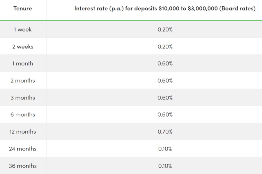 The highest board rate you'll get to enjoy is 0.80 per cent p.a., which is not worth your time. For example, with $500, you can get 1.15 per cent p.a. (three months) with ICBC or 1.35 per cent p.a. (6 or 12 months) with the Bank of China.