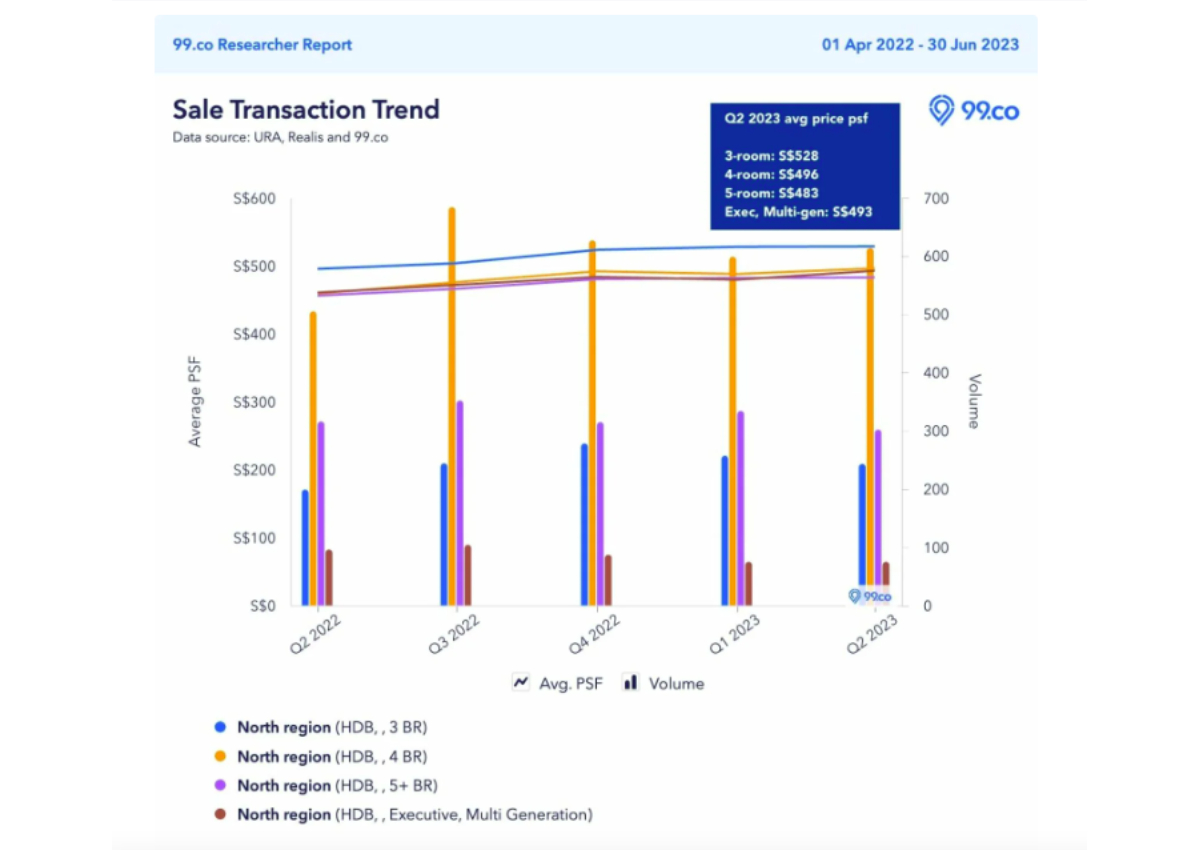 And similar to the HDB resale flats in the east, the average prices psf of the respective flat types in the north-east have been hovering around the same price range. In Q2 2023, prices range from $534 psf for executive and multi-gen flats to $571 psf for four-room flats.