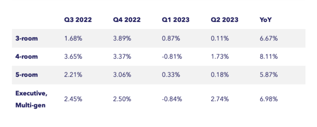 Here are the quarterly HDB resale price changes of the respective flat types over the past one year, from Q2 2022 to Q2 2023.