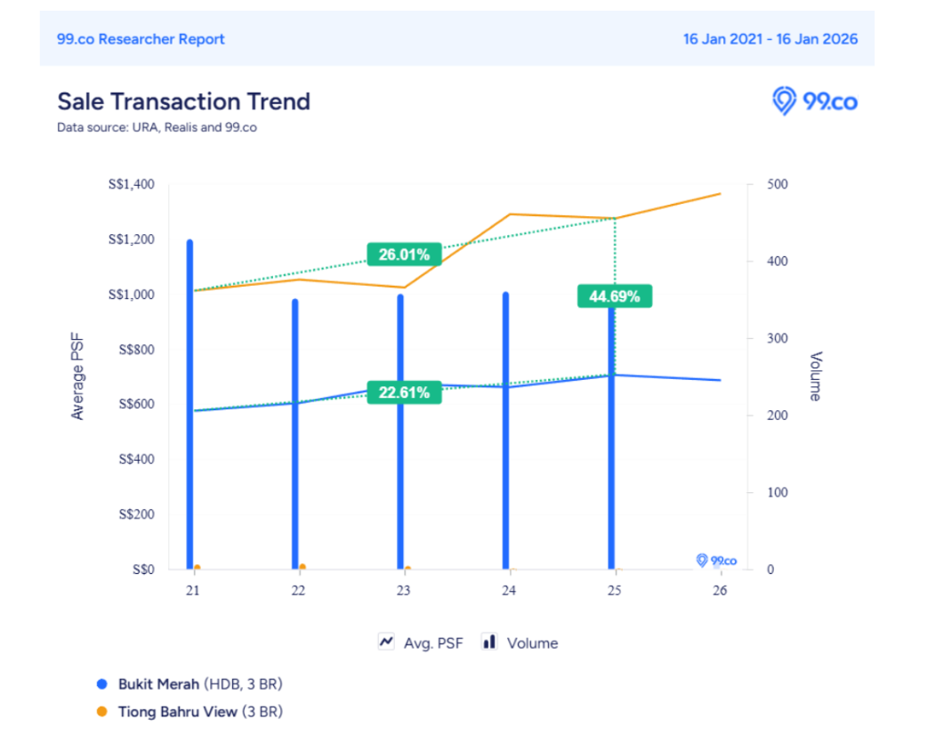 By 2025, the average psf for 3-room flats at Tiong Bahru View stood at roughly $1,200. In comparison, the average psf for 3-room units across Bukit Merah was closer to $705. That is a difference of nearly 45 per cent, which is substantial by any measure.