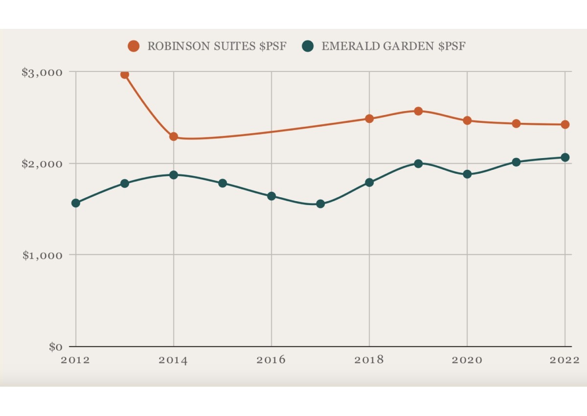 Both condos are situated in District one, Robinson Suites is freehold, while Emerald Gardens is 999-years, which is typically seen to be as good as freehold.