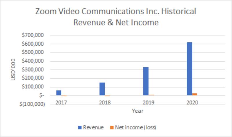 Zoom Video has seen rapid growth over the past 4 years. In the year of 2017, revenue was barely just US$ 61 million but surged to US$ 623 million as of the latest fiscal year of 2020. Zoom has been one of the tech companies to be in the black in their IPO year of 2019.