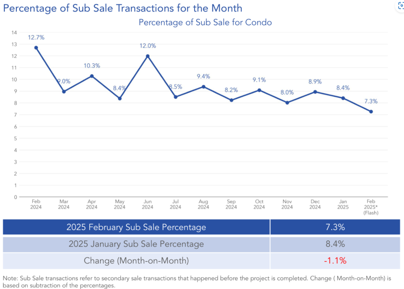 Sub-sale transactions, which refer to the resale of units before project completion, formed 7.3 per cent of total secondary sales in February, marking a slight dip from January.