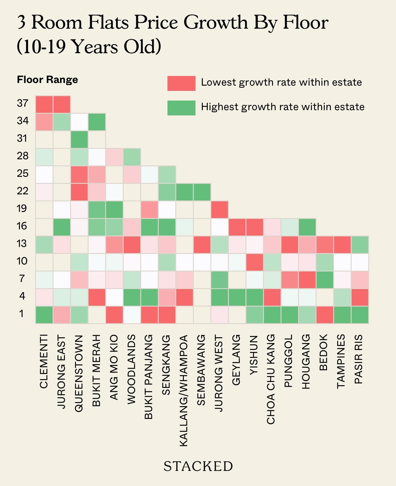 For 3-room flats, there is sometimes strong price growth for higher-floor units in non-mature estates. Towns like Punggol, Sengkang, Choa Chu Kang, Pasir Ris, and Woodlands show they can sometimes exceed 40 per cent price growth, with some even going past 50 per cent.