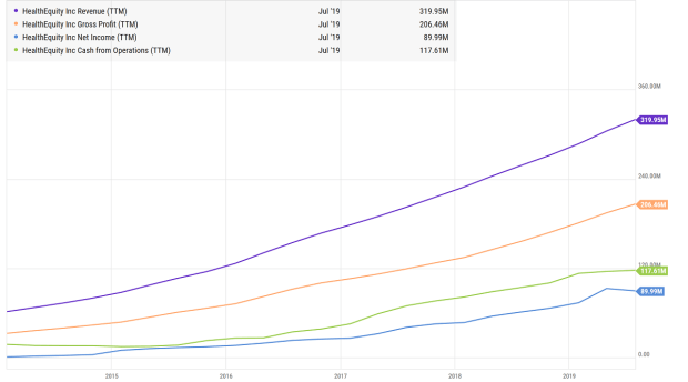 A quick glance at HealthEquity's financials also reveal that the company has been steadily growing its revenue, cash flow, and net income since it listed in January 2014: