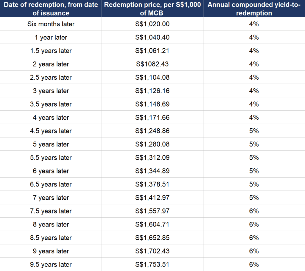 Redemption terms of the MCB: SIA has the right - but not the obligation - to redeem the MCBs every six months from the date of issue at a certain price, giving you a certain yield. If the MCBs have yet to be redeemed when we hit the 10-year mark from the date of issue, SIA is obliged to convert the MCBs into SIA shares, as mentioned earlier. The redemption prices and yields are given in the table below. Note that you cannot ask for the redemption - it is entirely up to SIA to decide.