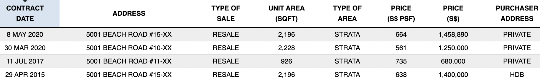 The last transaction, on 8th May 2020, saw a massive 2,196 sq. ft. unit transact at just $1,458,890.