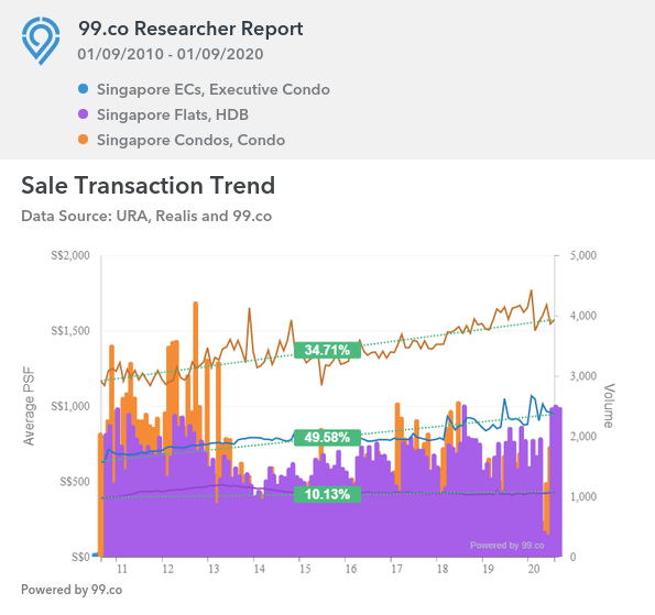 However, the question is how much an EC appreciates, compared to properties like HDB flats and regular condos. Here’s a quick snapshot of the situation today: