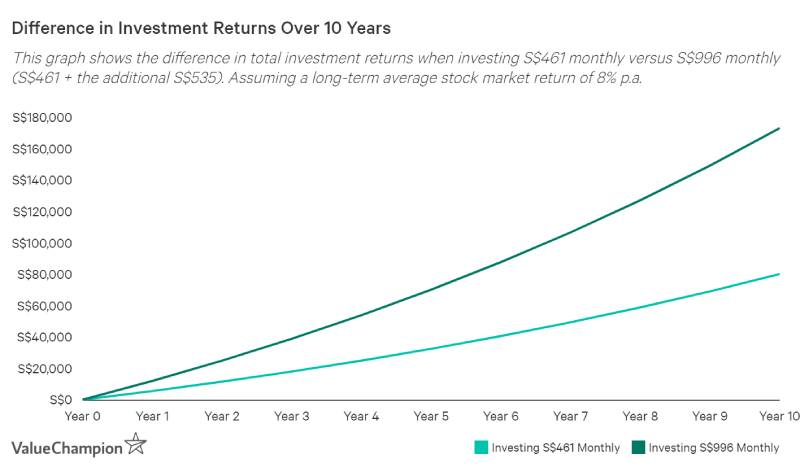 If you add in the extra $535 per month to your investment portfolio for a total of $996 per month, you would increase your total 10 year returns to $179,404 (before accounting for any fees)—a 116 per cent increase.